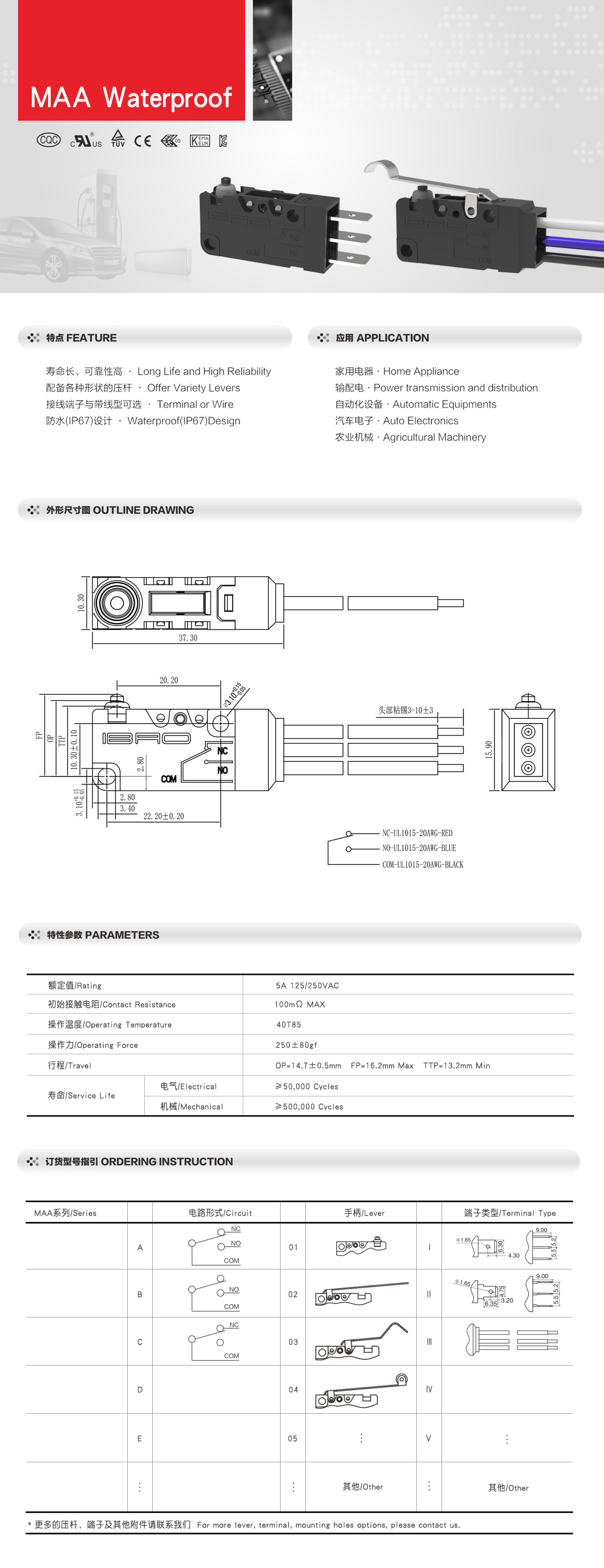 MAA系列 防水微动开关 Ⅰ型外壳 焊线包塑款