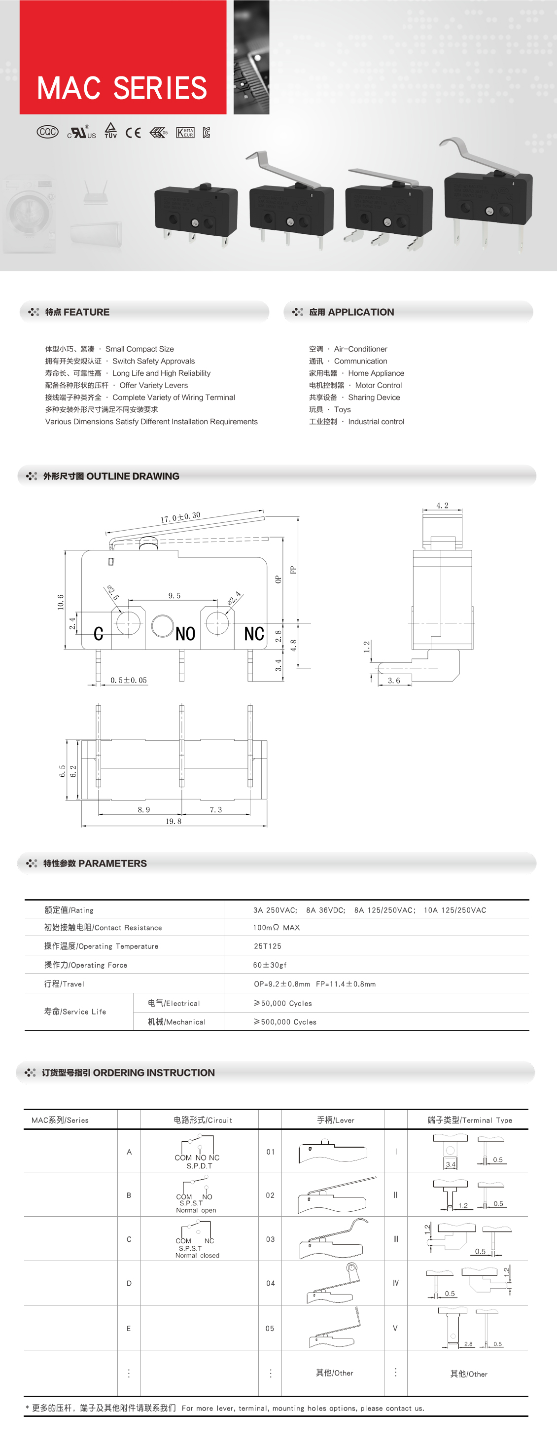 MAC系列 微动开关 长焊线端子脚 多规格压杆