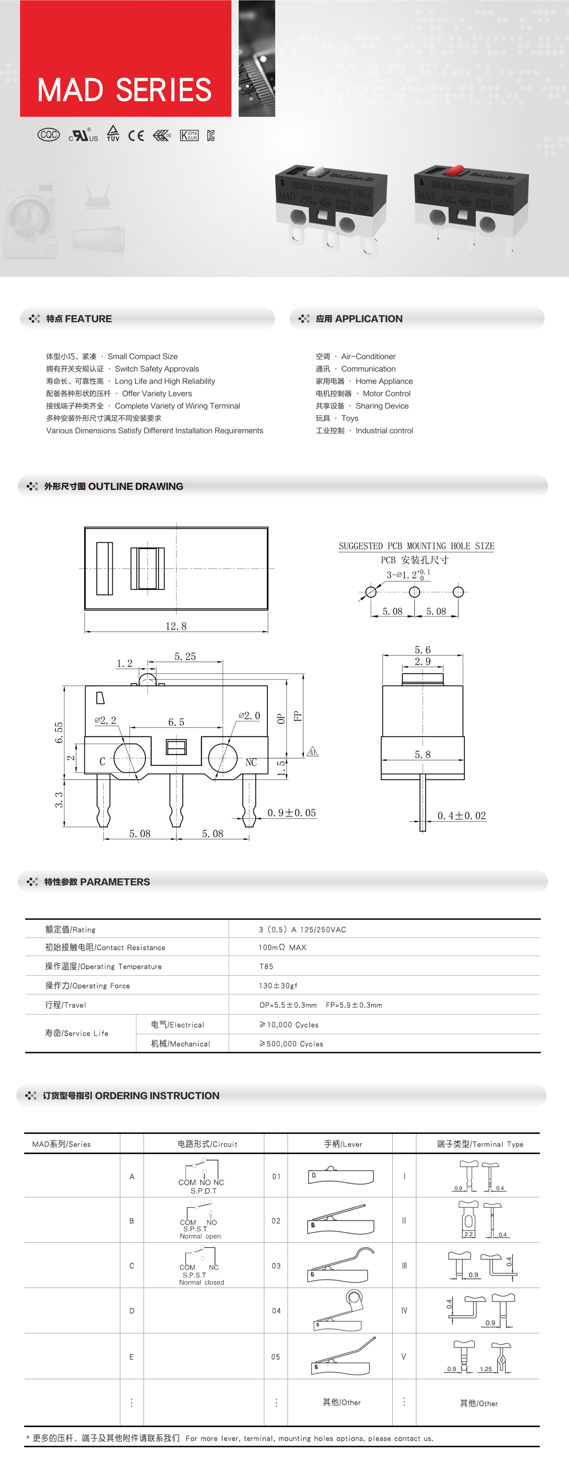 MAD系列 微动开关 PCB端子脚 多规格压杆