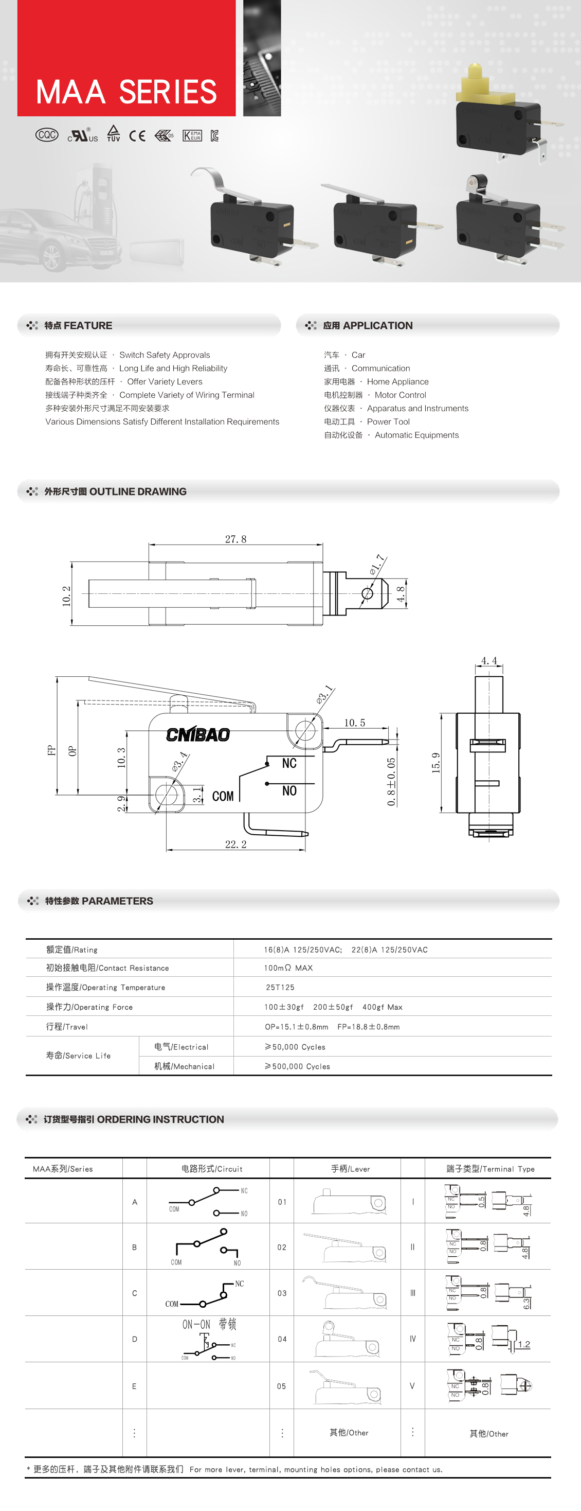 MAA系列 微动开关 常闭型电路 多规格压杆端子