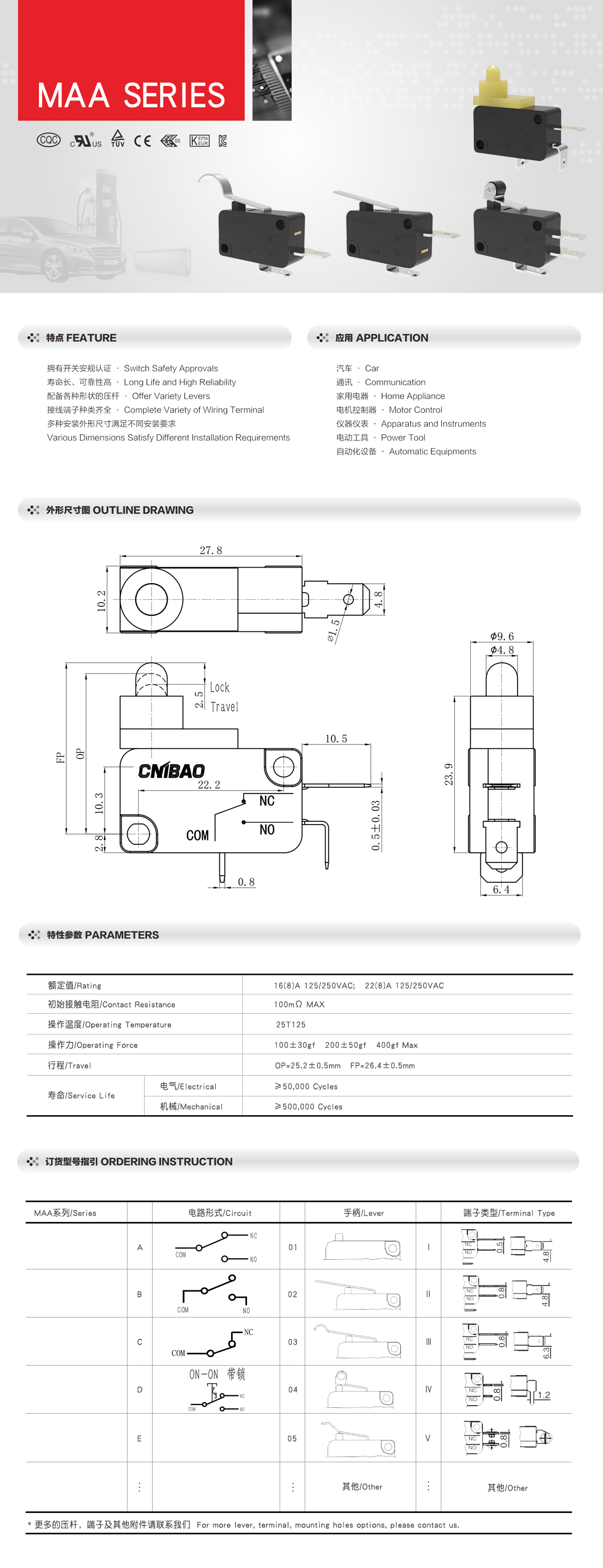 MAA系列 微动开关 常闭型电路 多规格压杆端子