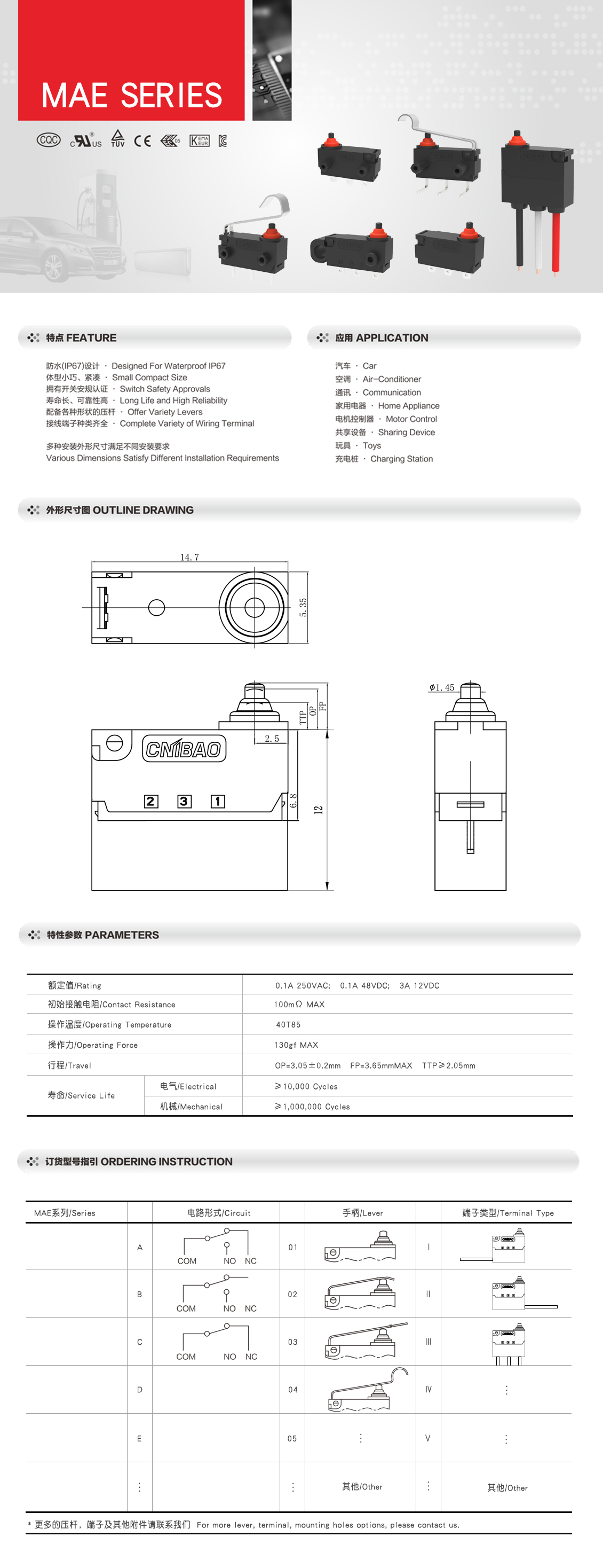 MAE系列 防水微动开关 Ⅳ型外壳 焊线包塑款