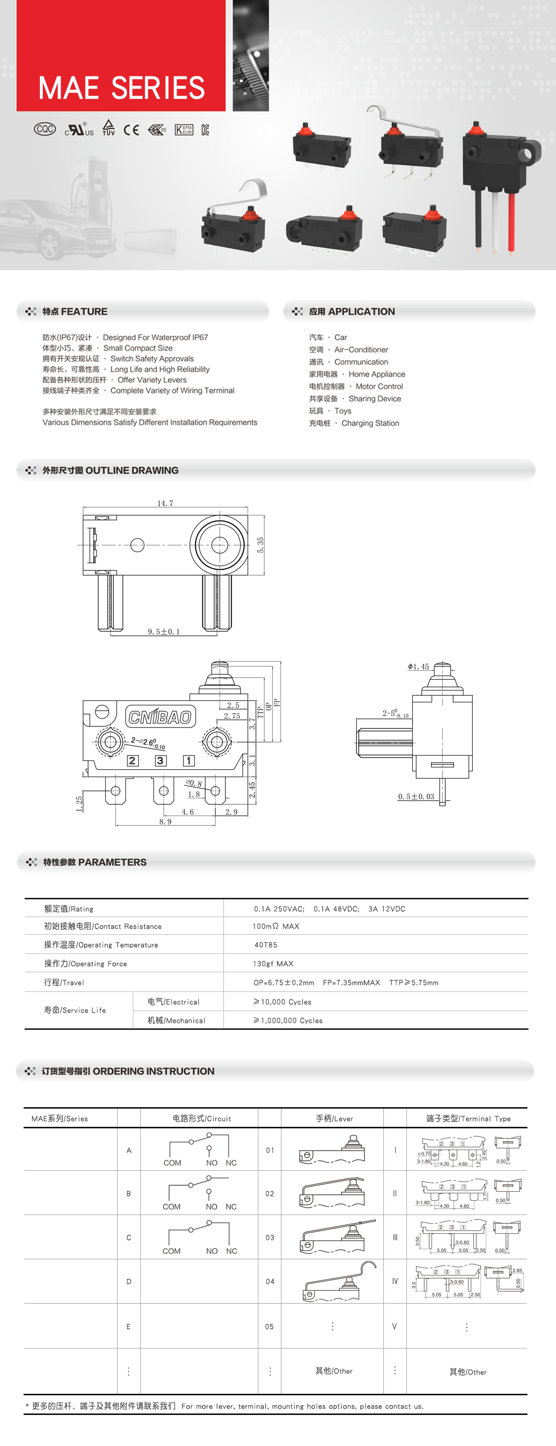 MAE系列 防水微动开关 Ⅲ型外壳 可焊线包塑