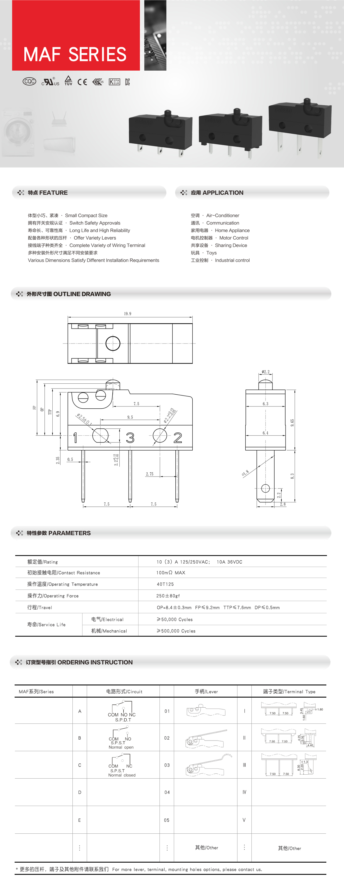 MAF系列 微动开关 长焊线端子脚 多规格压杆