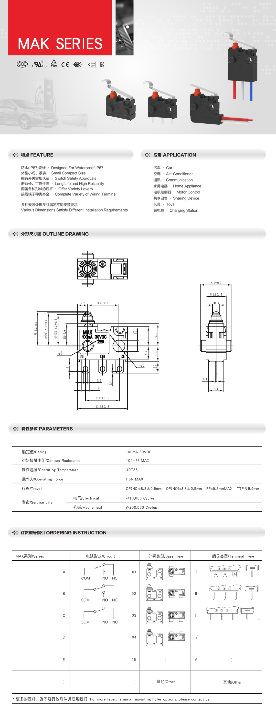 MAK系列 防水微动开关 Ⅰ型外壳 可焊线包塑