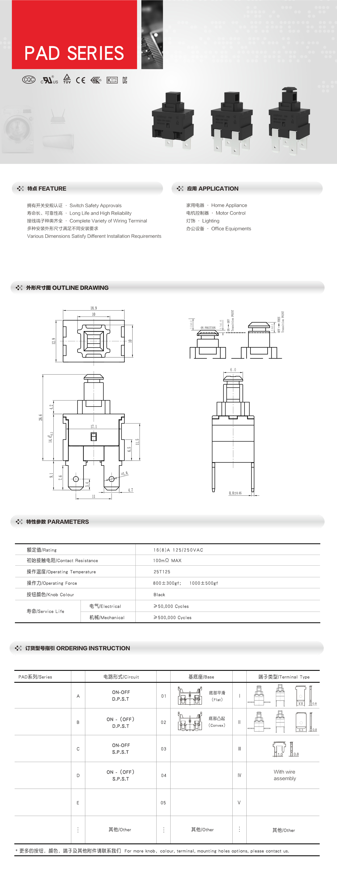 PAD系列 按钮开关 平头自锁/无锁双排4脚按键开关