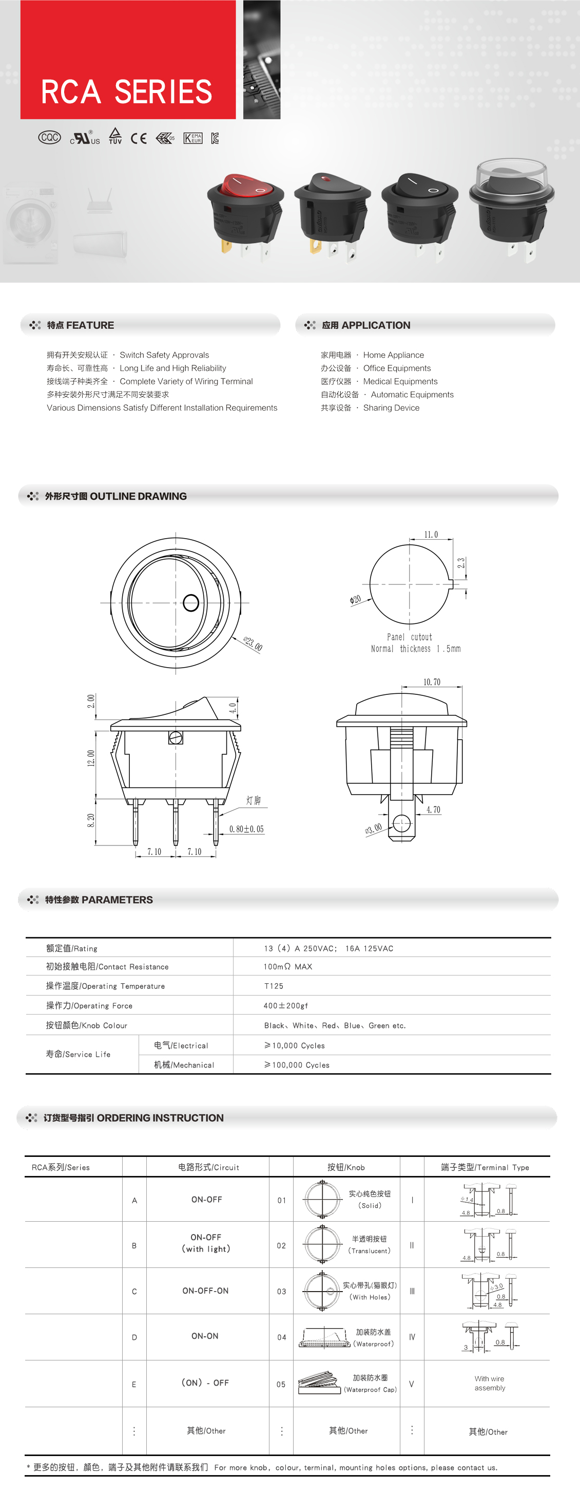 RCA系列 船型开关 圆形翘板开关猫眼灯款 多规格按钮端子