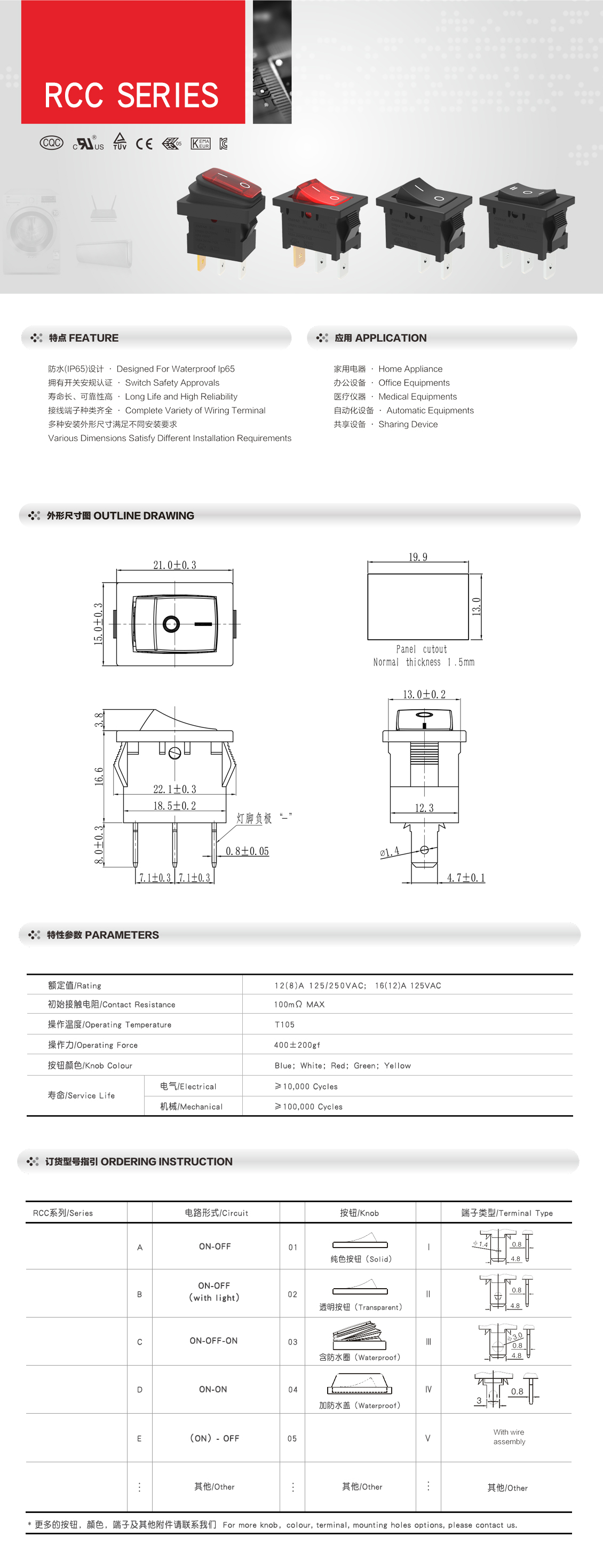 RCC系列 船型开关 方形翘板开关KCD1 带灯(红、绿、蓝)