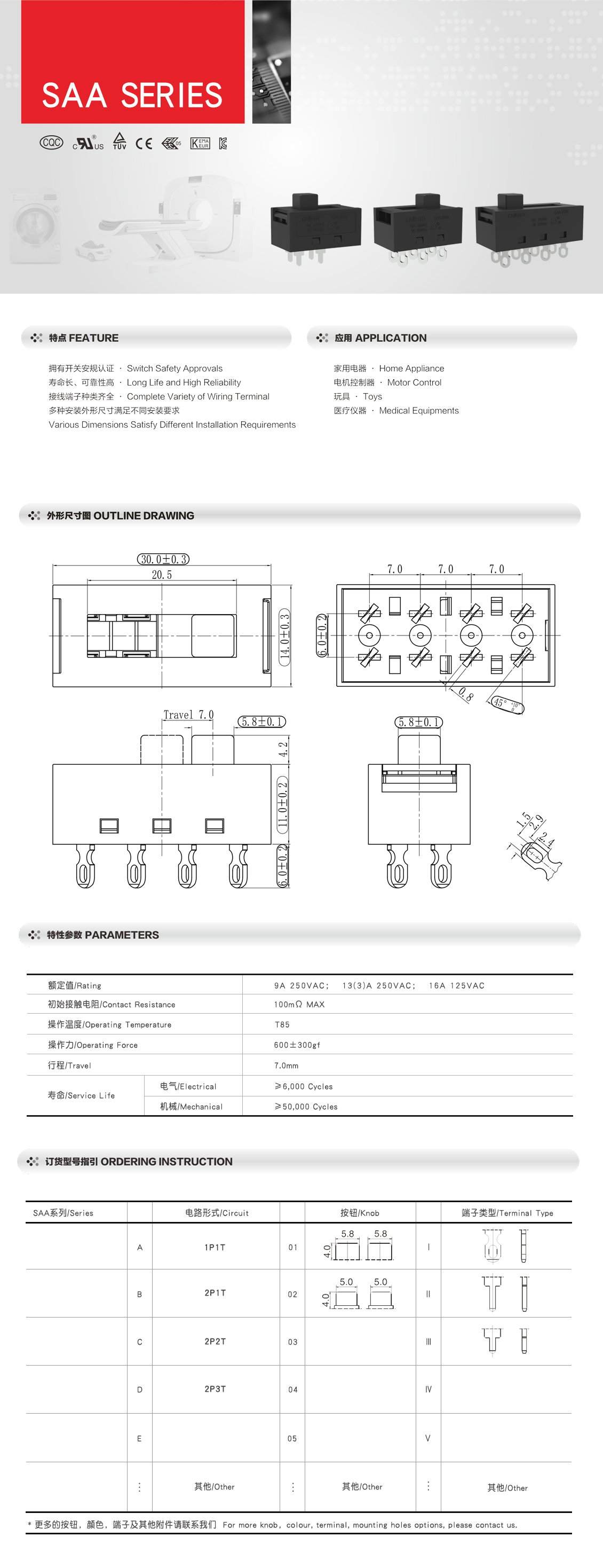 SAA系列 拨动开关 8脚三档塑料滑动开关