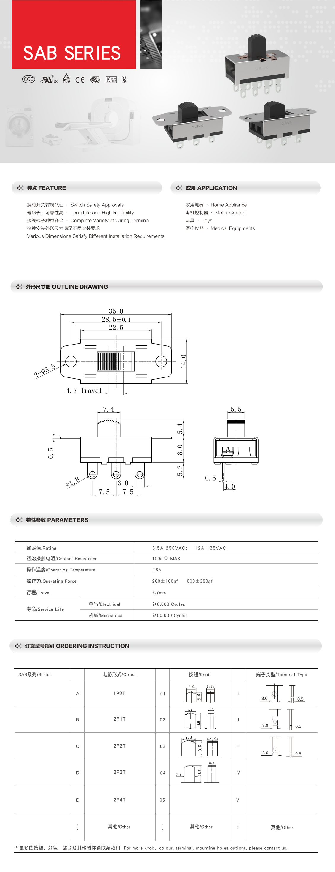 SAB系列 2档拨动开关 3脚单极双位滑动开关